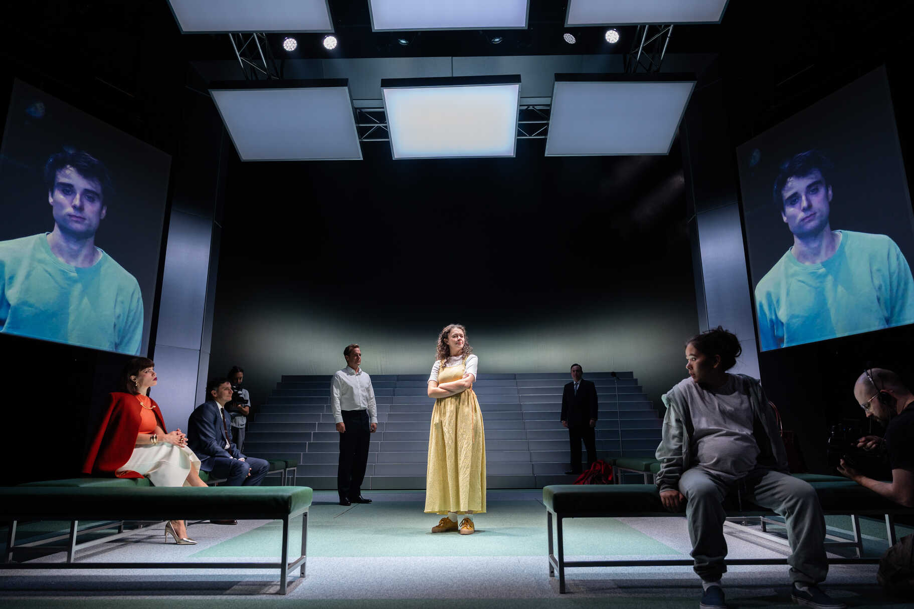 Frankie Bradshaw’s set design immediately anchors that vision. The stage gleams with polished steel and glass, an environment that evokes both the House of Commons and a corporate boardroom. Glass prison walls descend like instruments of judgement; later, steps emerge for a press conference that feels chillingly authoritarian. The design is both beautiful and brutal, constantly shifting between the sterile order of government and the suffocating containment of surveillance. Live camera feeds heighten this world of exposure and shame – we see the guilty faces of politicians projected onto huge screens, their downfall consumed like entertainment. The audience becomes complicit, both judge and voyeur, a public that delights in humiliation as much as justice.